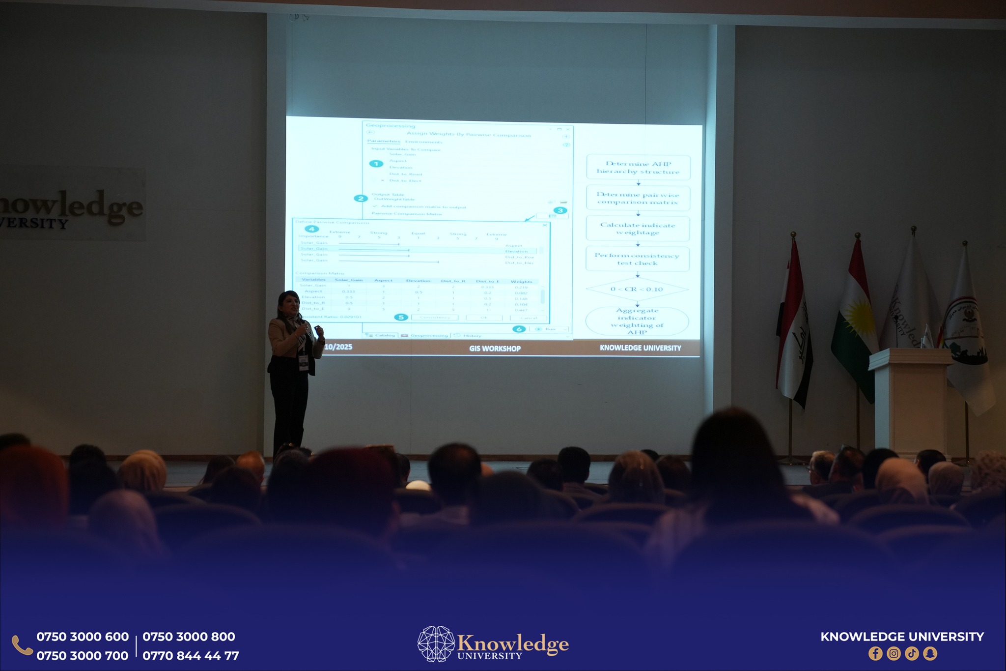 Within the framework of academic and practical activities, and according to a memorandum of understanding, the College of Engineering – Departments of Petroleum and Environmental Engineering – in coordination with the Erbil Municipality, and with the participation of distinguished figures including Deshti Haji Najmuddin (Head of Security Department), P.D. Ahmed Dzeiyi (President of Knowledge University), Dr. Agrin Abdullah and Dr. Hakim Walian (Ministry of Water Resources and Settlement), Dr. Ali Rashid (Head of Erbil Governorate Council), Engineer Karzan Abdulhadi (Mayor of Erbil), academic and administrative staff, students, and both local and international guests, organized a workshop titled "From Data to Decision-Making: GIS for City Planning and Development."