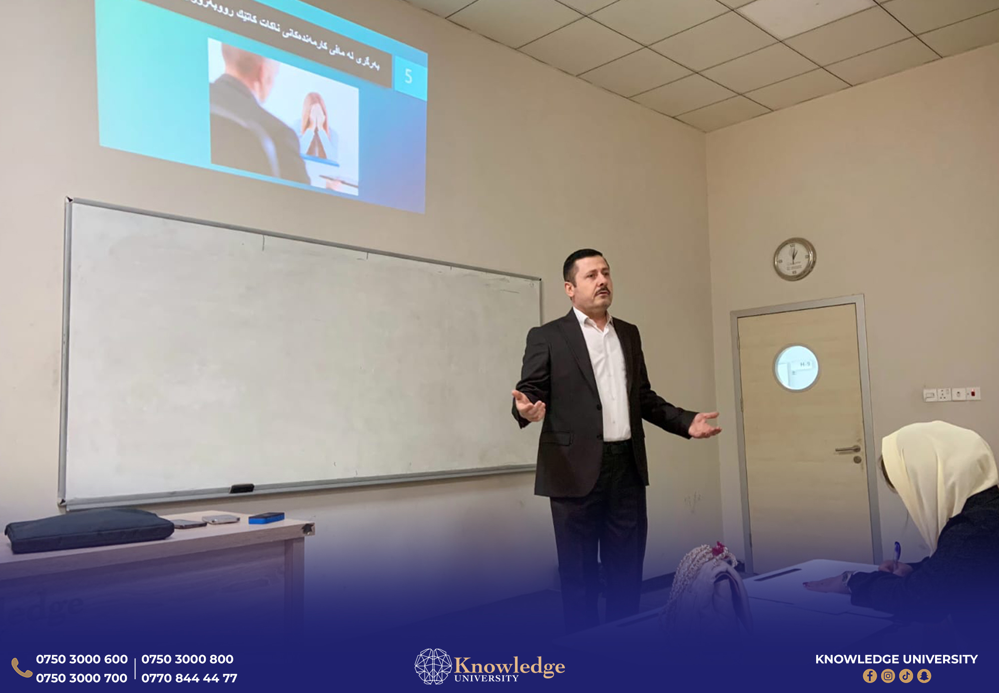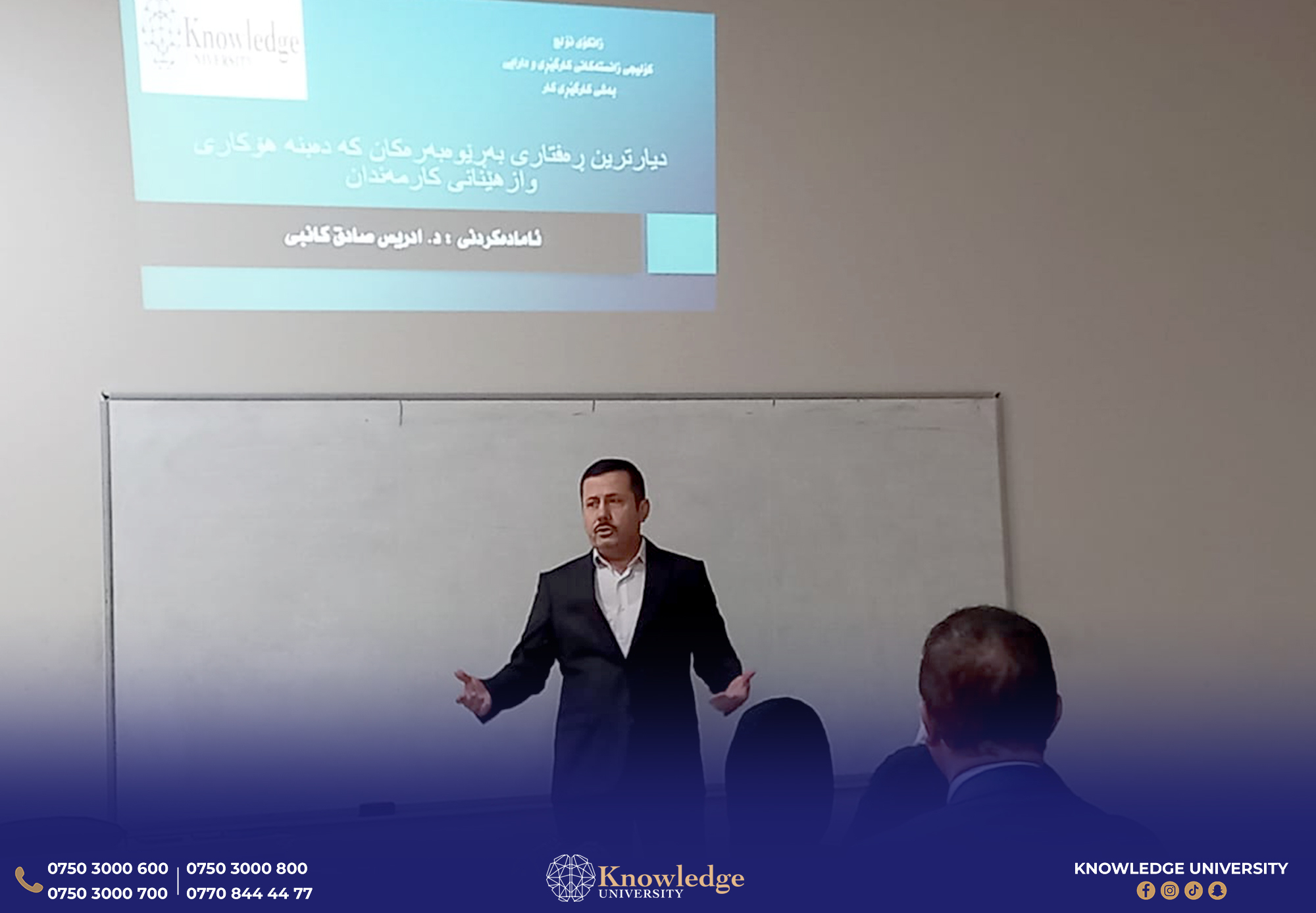 On Tuesday, October 14, 2025, the Department of Business Administration at Knowledge University held a seminar presented by Dr. Idrees Sadeq Kanabi, a faculty member at the College of Administrative and Financial Sciences. The seminar was titled “Key Managerial Behaviors That Contribute to Employee Turnover.”
