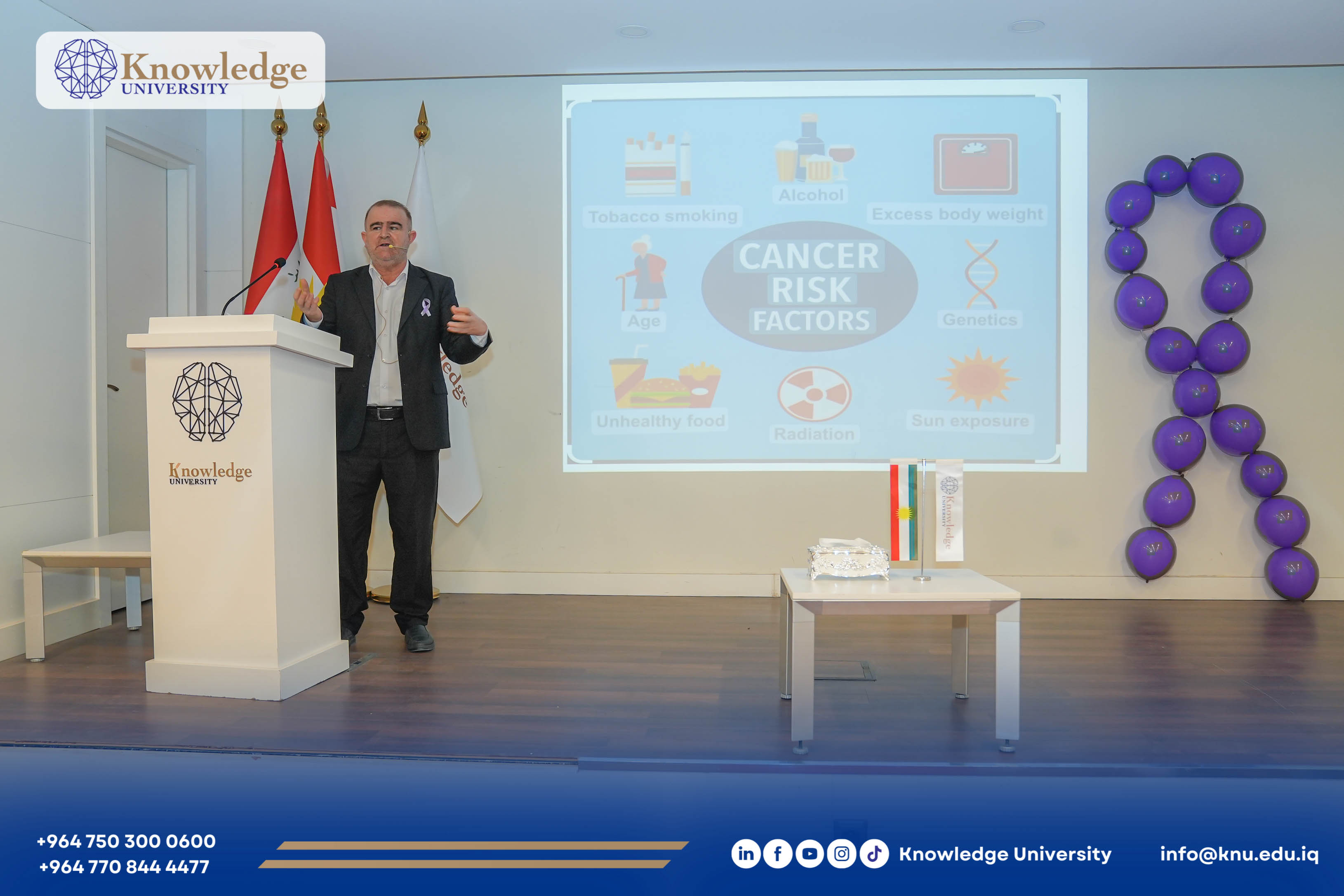 On the occasion of World Cancer Day (4 February), the College of Nursing at Knowledge University organized an academic awareness seminar aimed at promoting public health education and preventive healthcare practices. The seminar was conducted under the supervision of Mr. Adnan Rashid Aziz and focused on cancer, including its causes, patterns of spread, and prevention strategies.