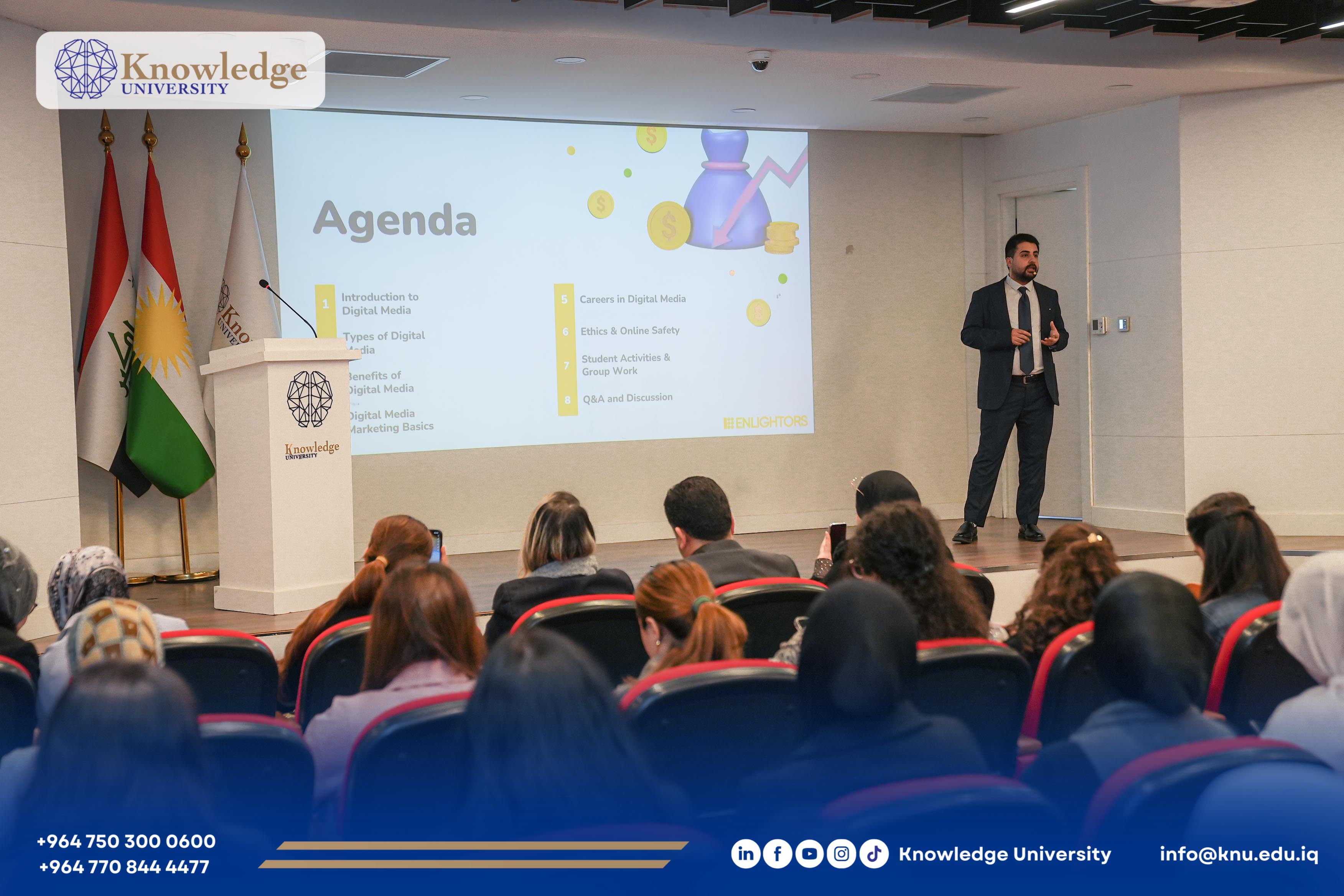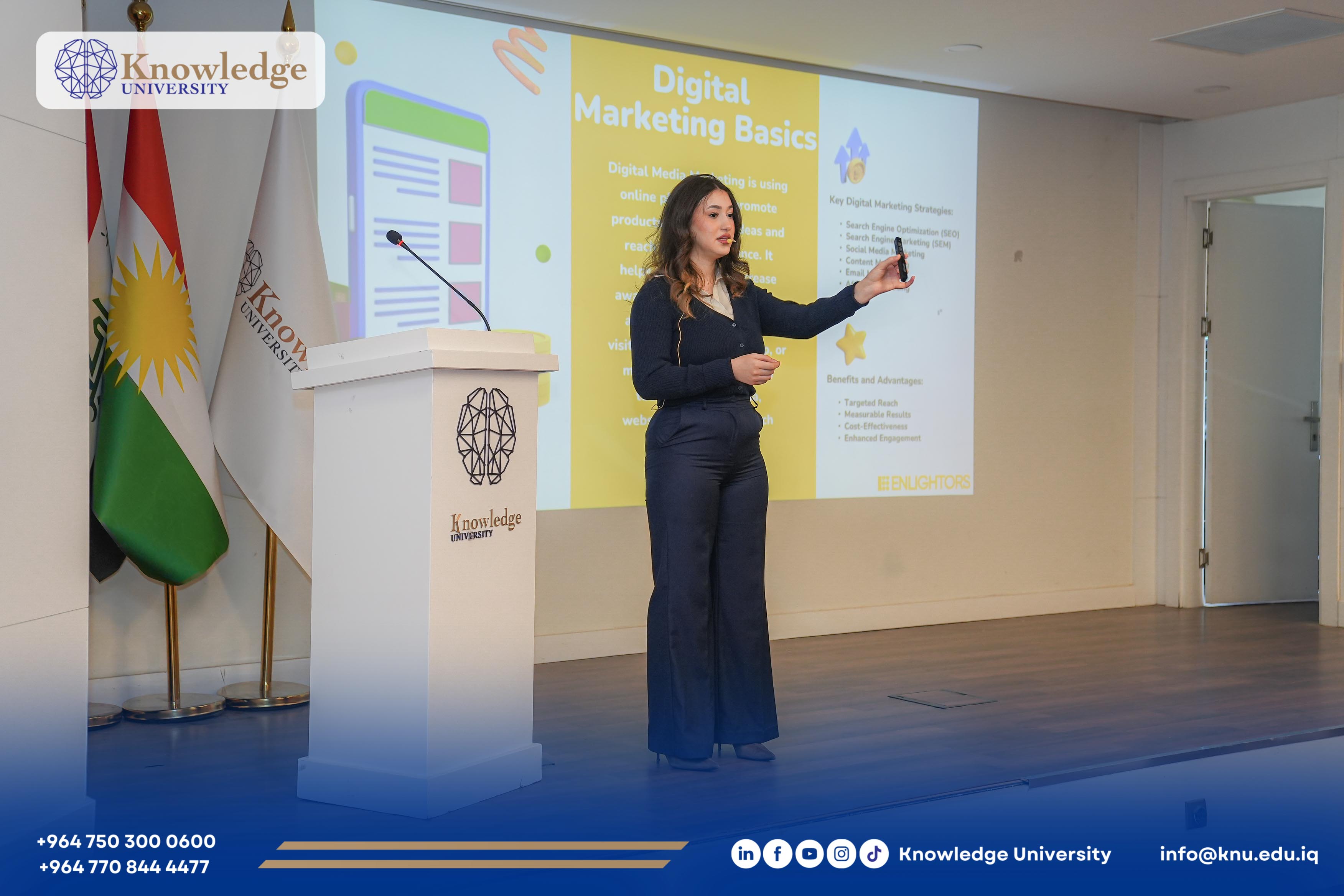 The Career Development Center (CDC) at the College of Engineering, Knowledge University, in collaboration with Enlightors Company, successfully organized a workshop entitled “Tech in Business” under the theme “Women in Tech.” The workshop aimed to support and empower women in the field of Digital Media and enhance their readiness for today’s competitive job market.