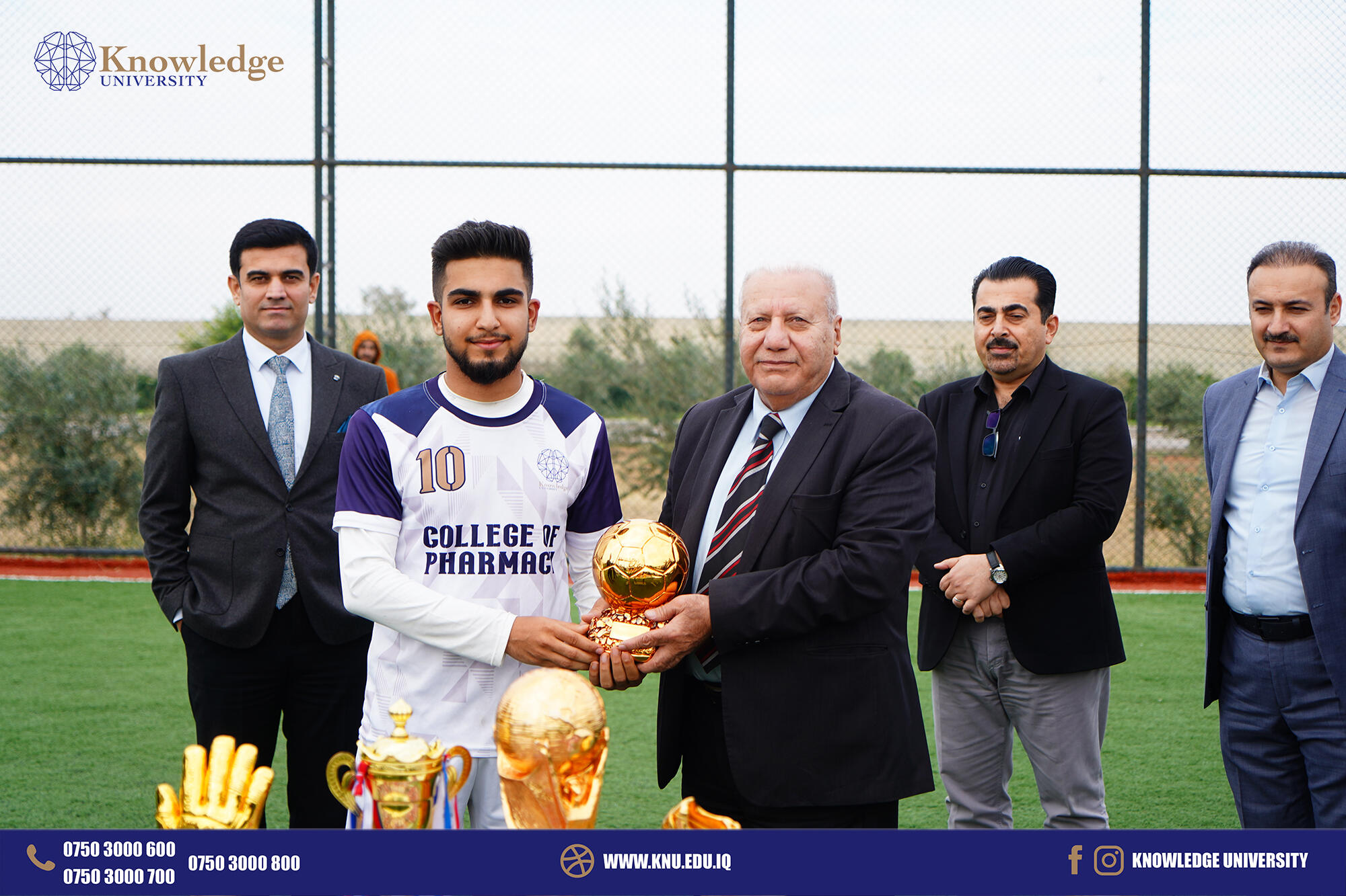 The College of Pharmacy at Knowledge University witnessed an exhilarating culmination to its students' football tournament as the final match unfolded on November 18, 2023. The battle for supremacy on the pitch saw "Third Stages" emerge as the champions of the tournament, showcasing exceptional skill and teamwork. In a ceremony graced by esteemed dignitaries, including the President of Knowledge University, Assoc. Prof. Dr. Kayhan Zrar Ghafoor, Vice President Prof. Dr. Talib Khalil Ibrahim, and the Head of the Pharmacy Department, Dr. Tariq Waisi, the victorious team was awarded the coveted trophy. Medals were ceremoniously distributed to both the winners and the commendable runners-up, acknowledging their sportsmanship and dedication throughout the tournament.